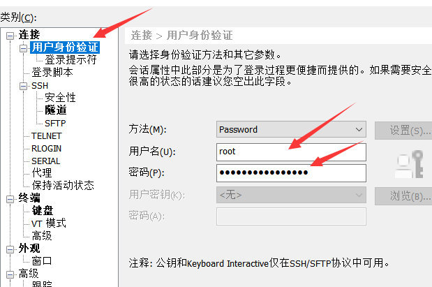 点击【用户身份验证】方法选择【Password】,填写服务器的用户名和**密码,**用户名用root,密码就是上一步骤中VPS发送给你的密码。