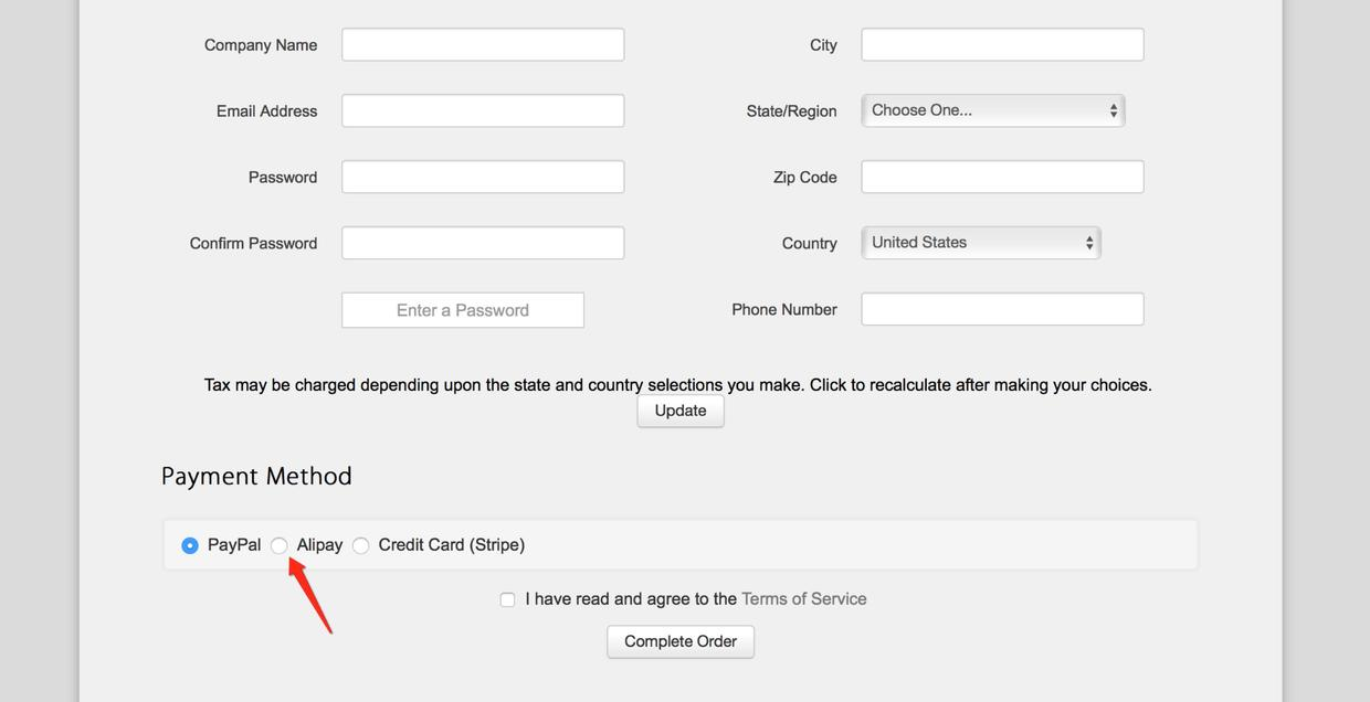 填写完相关的资料后付款,选择【Alipay】直接支付宝扫码付款。