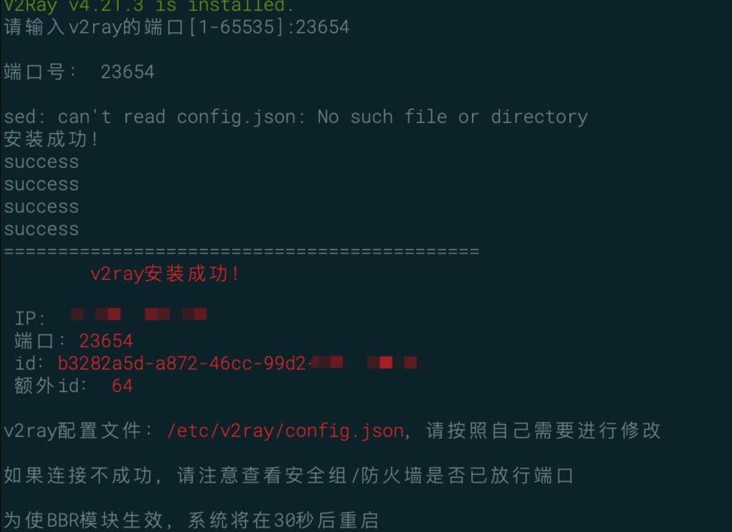 按回车键,屏幕出现 “请设置v2ray的端口[1-65535]” 的提示,输入一个你希望的端口号(例如12345,不能是22)。 接下来,屏幕上会一直出现许多代码的东西,有时候可能会卡一会儿,等就是了。 如果中间网络断开,请重新连接后再次执行命令。安装成功后截图如下:
