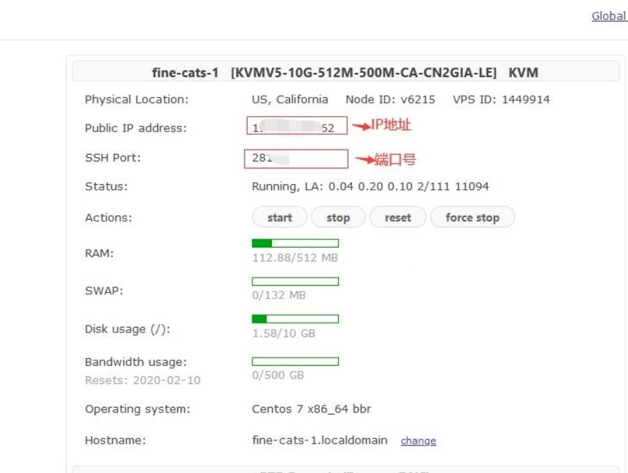 侧边栏选择【Main controls】,可以看到当前服务器的信息,【**IP】**地址后续需要提供给客户端。操作系统默认安装了【Centos】,你可以在左边的【**Install new OS】**中选择其他的系统,有