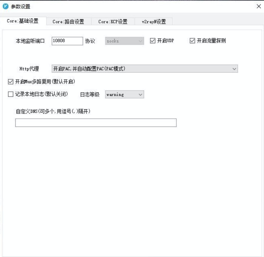 4、点击主界面上的「参数设置」,在「Core:基础设置”中将“Http代理」选择「开启PAC,并自动配置PAC(PAC模式)」。