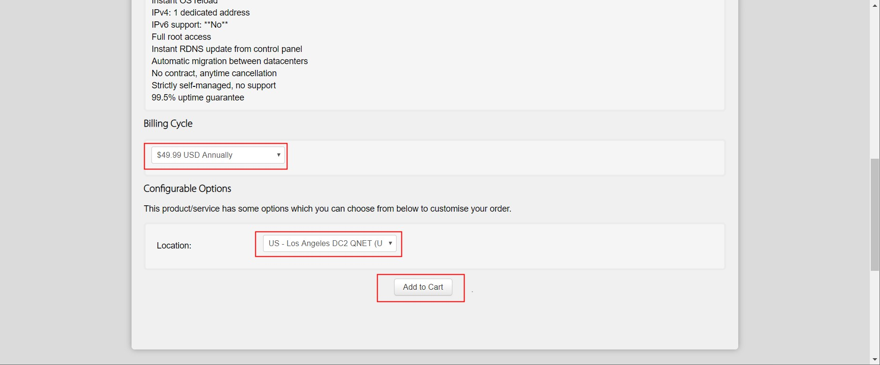【Billing Cycle】是付费周期,目前大部分只支持按年支付。【Location】是服务器的地址,到时候打开谷歌首页显示的国家会和这个相关,然后点击【Add to Cart】就可以准备支付了。