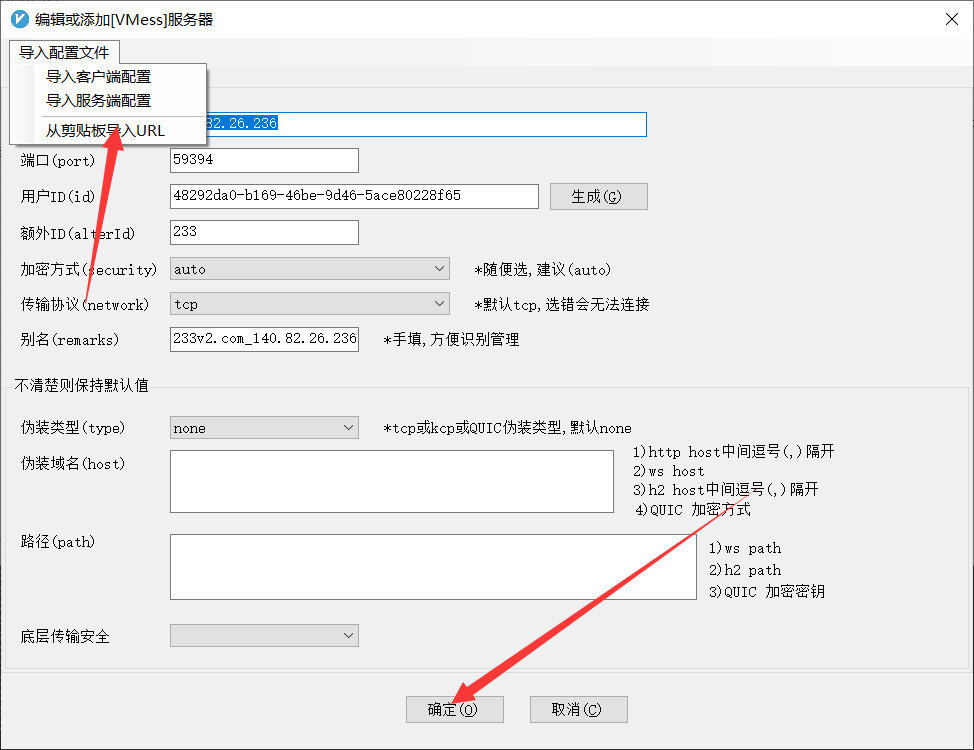 3、把上一个步骤生成的服务端信息,填写到这里的服务器地址(域名或ip)、端口、用户id、额外id,这几项非常重要! 加密方式一般都是auto,传输协议一般是tcp。